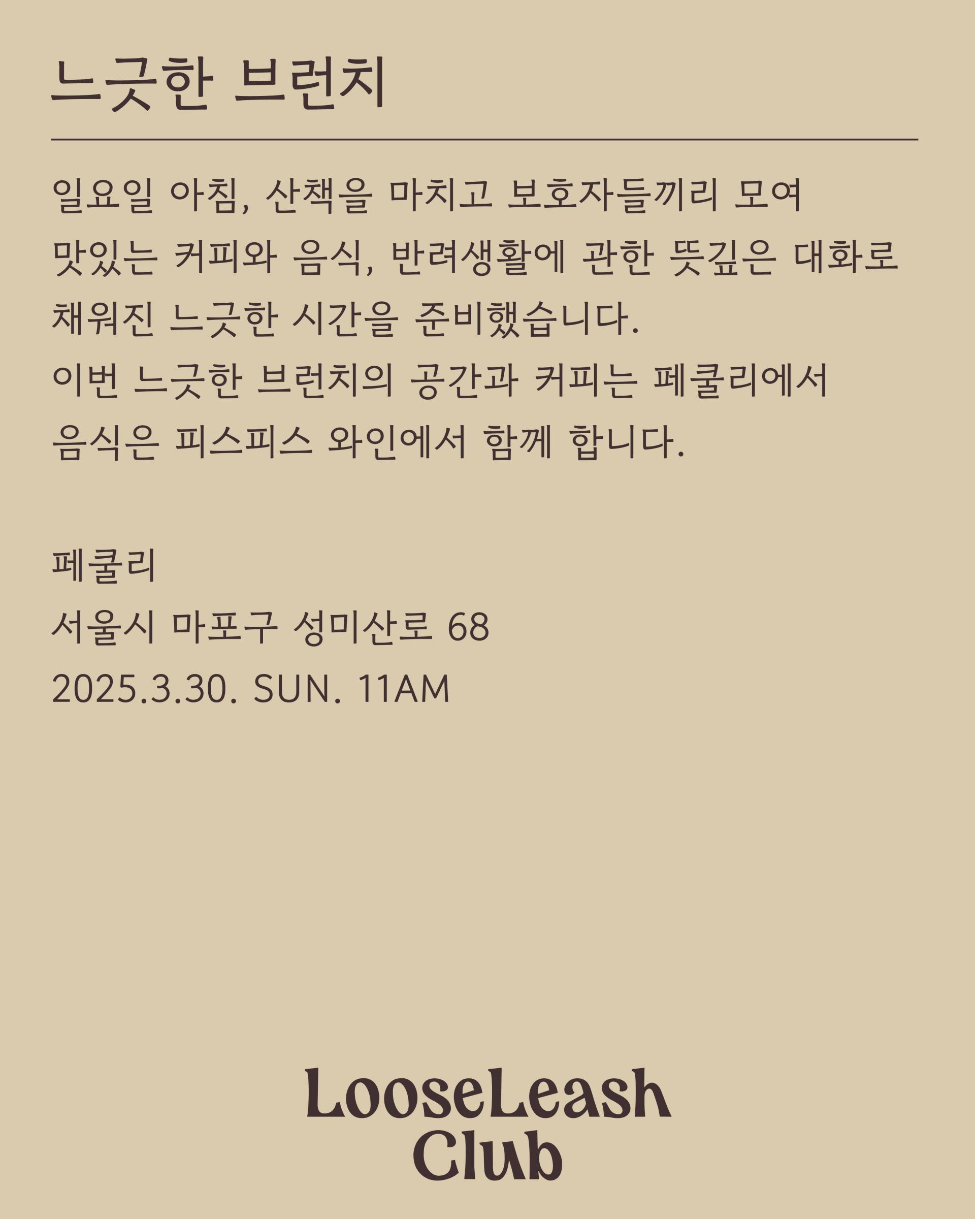 일요일 아침, 산책을 마치고 보호자들끼리 모여 맛있는 커피와 음식, 뜻깊은 대화로 채워진 느긋한 시간, 느긋한 브런치입니다.